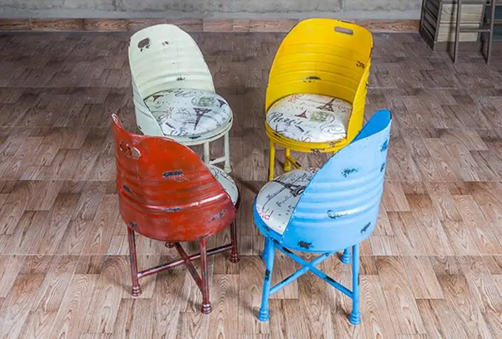 | Bar chair. Iron oil barrel stool. Paint bench. Tin bucket |